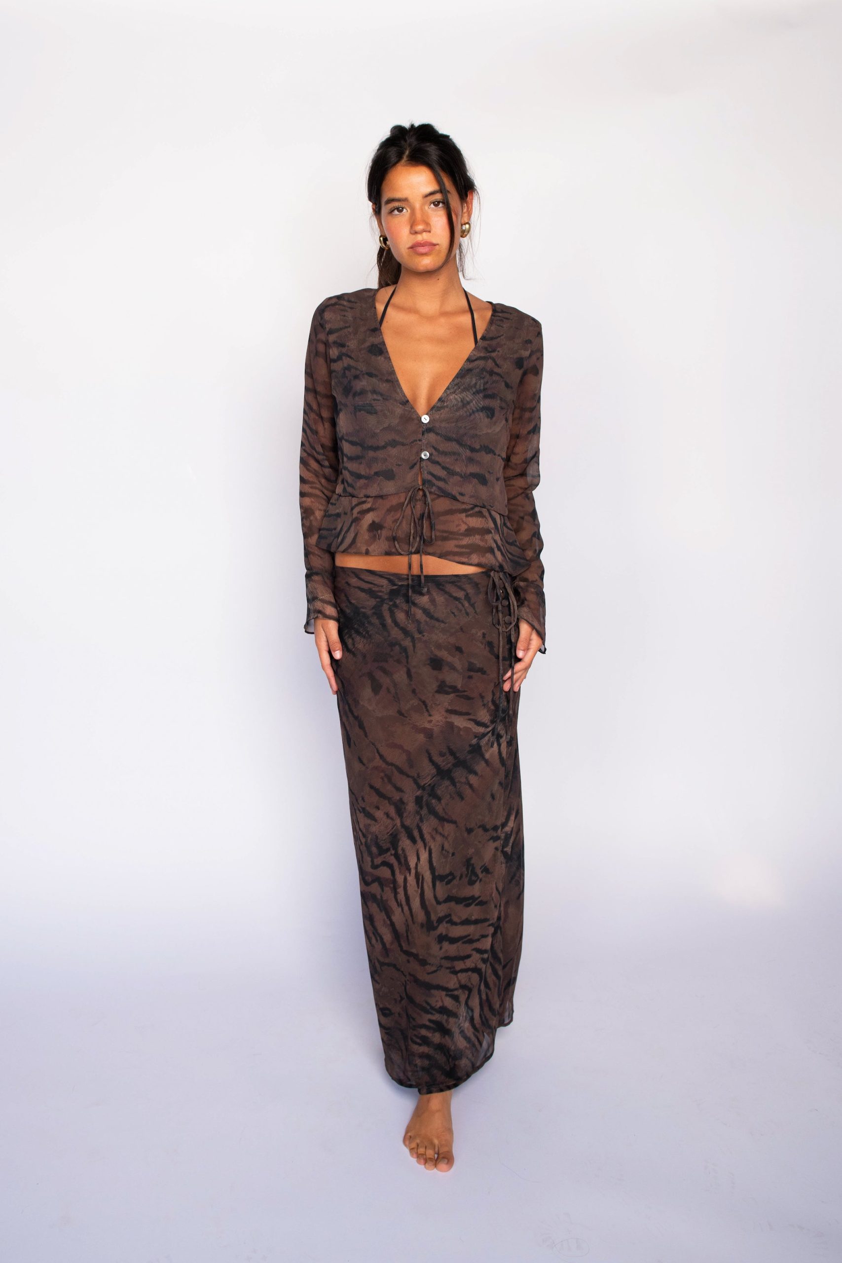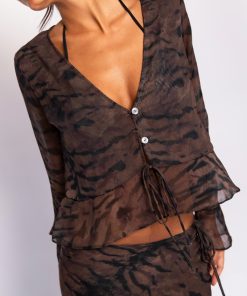 This v-neck blouse has a two-button closure and a tie at the waist, just above where the ruffled hem begins. The single-layer chiffon is slightly sheer, making Colette feel a little bit edgy.