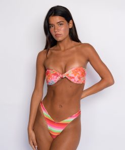 Lyndi is a knotted bandeau with removable halter straps. This top has structured sides that keep her in place, but her skimpy coverage makes her perfect for tanning! She’s got removable padding that allows the top to hold better shape.